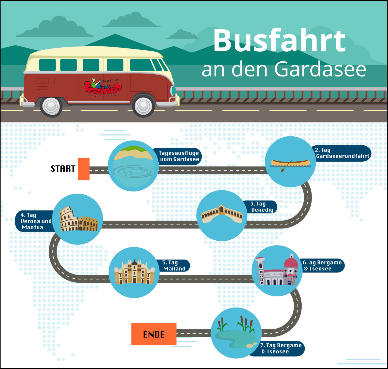Reisegruppen von Jung bis Alt haben mit unseren Busurlaubsreisen die Möglichkeit, einen kostengünstigen und abwechslungsreichen Urlaub zu genießen. Während Sie chauffiert werden, können Sie in aller Ruhe die Fahrt genießen, Zeitung lesen, ein bisschen dösen oder sich unterhalten. Während der Fahrt erhalten Sie je nach Route Hinweise auf besonders schöne Aussichtspunkte, landschaftliche Gegebenheiten oder inspirierende Geschichten rund um Land und Leute. Der Bus macht eine Urlaubsreise sehr flexibel, da er während der gesamten Fahrt für Sie zur Verfügung steht. Entspannt fahren wir Sie auf der Busreise Gardasee von einer Stadt zur anderen und unterwegs haben Sie die Möglichkeit viele Sehenswürdigkeiten zu sehen und regionale Traditionen zu erleben. Bei kurzen Pausen können Sie sich die Beine vertreten, während der Bus mitsamt Ihrem Gepäck vom Busfahrer im Auge behalten wird. Sie brauchen nicht umsteigen, kein lästiges Gepäckschleppen, keine hektische Suche nach den Flugtickets am Check-in Schalter. Und die Gruppendynamik, die bei Busreisen aufkommt, suchen Sie bei Auto- oder Flugreisen in dieser Form vergebens.