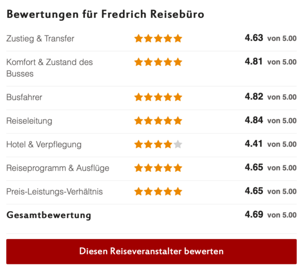 Fredrich ist ein familiengeführtes Bus-Reiseunternehmen mit über 33 jähriger Erfahrung und Kompetenz im Bereich Bus- und Urlaubsreisen. Jährlich vertrauen Fredrich ca. 30.000 zufriedene Kunden die besonders viel Wert auf Qualität, bequeme Busse und Sicherheit legen. Dabei sorgenlos und entspannt Reisen um die faszinierendsten Reiseziele zu entdecken, unvergessliche Momente zu erleben und neue Freundschaften zu schließen, das ist unser persönliches Anliegen. Es freut uns, wenn unsere Kunden an unserem 33 jahrelangen Erfolg teilhaben können und glücklich sind. Unsere zufriedenen Kunden haben Fredrich zu dem gemacht, was wir heute sind und dafür möchten wir ''DANKE!" sagen, denn bei Fredrich steht der Mensch im Mittelpunkt!