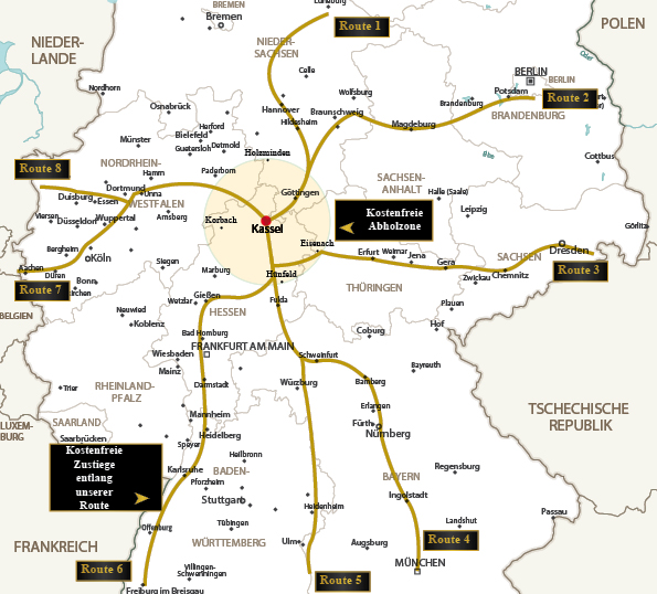 Die Routen sind Reisen zugeordnet, diese finden Sie im Leistungskasten ganz unten im Reisekatalog, oder auf der Seite auf unserer Website der jeweiligen Reise. Vergleichen Sie dann, welche Route gefahren wird und suchen Sie sich Ihren Zustiegsstelle auf der Route. Wir empfehlen Ihnen auch gerne einen passenden Zustiegsort für Sie.